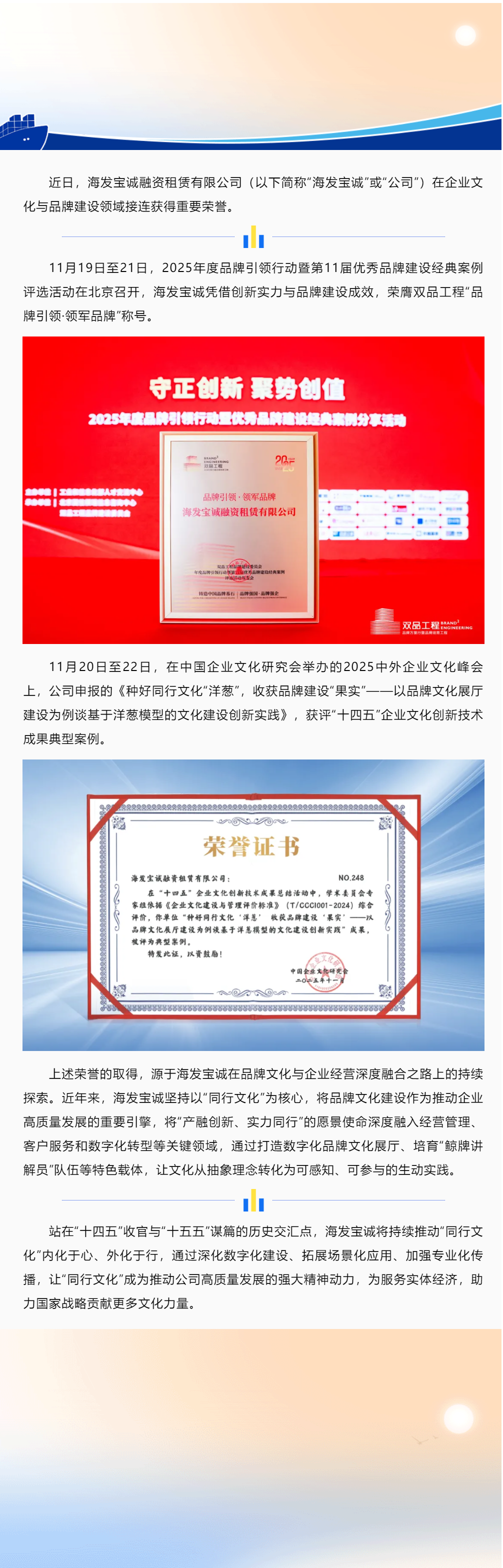 海发宝诚品牌文化建设成果荣获“品牌引领·领军品牌”等两项荣誉